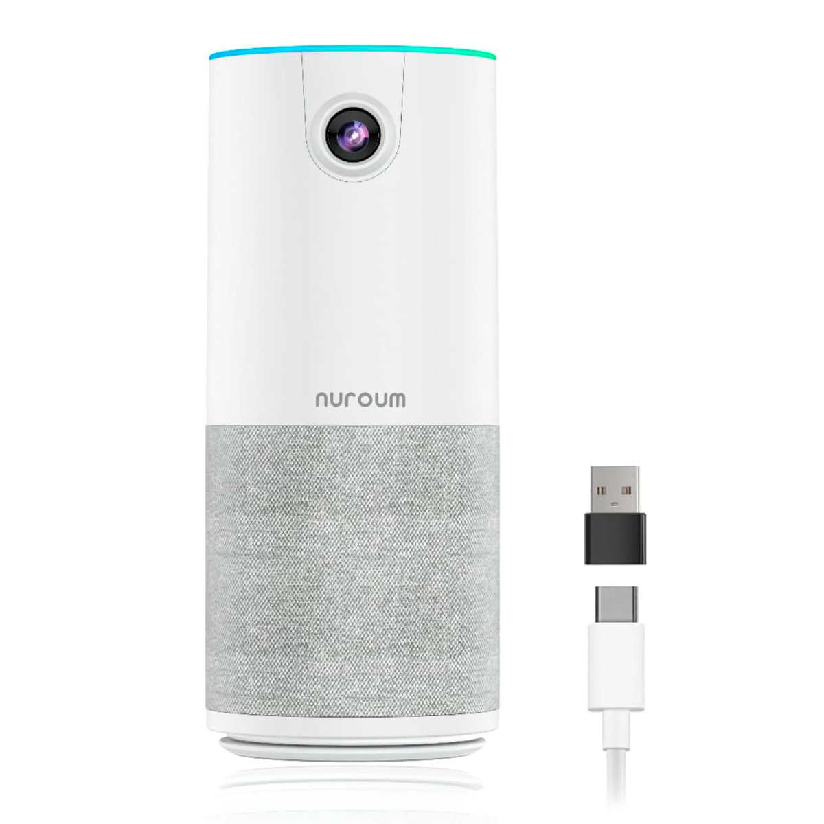 Камера для видеоконференций Nuroum C10 подключается и питается от прилагаемого кабеля USB-C, в дополнение к нему в комплекте идет USB-A адаптер, который можно хранить в специальном углублении на дне камеры. Не требуется установка драйверов, не требуется сетевой адаптер питания. На верхней панели расположены 4 сенсорные кнопки: быстрое отключение камеры, отключение микрофонов и регулировка громкости. Кольцевая подсветка на верхней панели отображает рабочее состояние камеры, поэтому ваша конфиденциальность всегда под контролем.