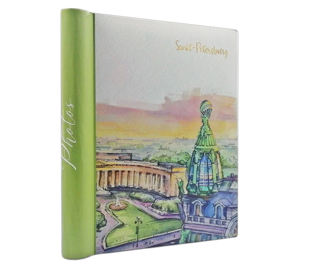 Магнитный альбом для фотографий разных форматов. Также подойдет для размещения рисунков, открыток, билетиков, картинок желаний, вырезок и прочего. Фотографии могут располагаться в произвольном порядке – вертикально, горизонтально или по диагонали. Твердая обложка выполнена из  картона, бумажные листы с магнитной пленкой скреплены пластиковой спиралью. На обложке изображена одна из визитных карточек Петербурга: вид на дом Зингера и Казанский собор. Альбом отлично подойдет для фотографий на память о путешествии в Санкт-Петербург.