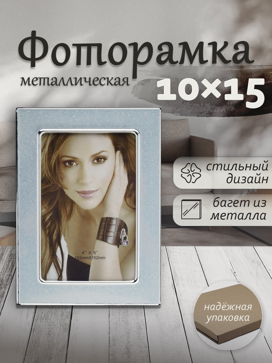 Металлическая фоторамка в тонком багете c глянцевой серебристой поверхностью и вставкой «под камень» (серо-голубая полированная поверхность в крапинку). Подходит для фотографий формата 10х15 см. Стекло минеральное, прочное (толщина 1.5 мм), задник выполнен из плотного листа оргалита с отделкой бархатной тканью, имеется ножка для установки на стол, полку или любую другую ровную поверхность. Интересный дизайн рамки хорошо подходит для самых разных стилей интерьера.